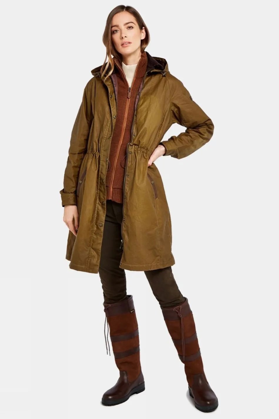 Where Countryside Practicality Meets Festival Chic, The Dubarry Ballyvaughan Is A Long Wax Cotton Coat With A Zip-Off Hood That Has An Adjustable Drawstring Waist For Your Style. There Are Exterior Hand Warming Pockets With Leather Trim And An Interior Pocket That Keeps Valuables Safe.