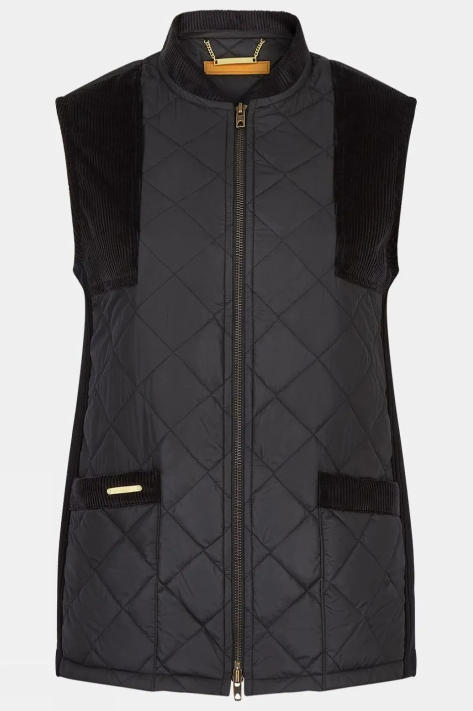 A Chic Update On The Classic Quilted Gilet By Troy London, With Gold Highlights In The Two-Way Zip, Neck Chain And Troy Branded Pocket Bar. Soft Cotton Corduroy Shoulder And Pocket Patches And Stretch Side Panels Provide Added Comfort And Soften The Sleek Quilted Exterior.